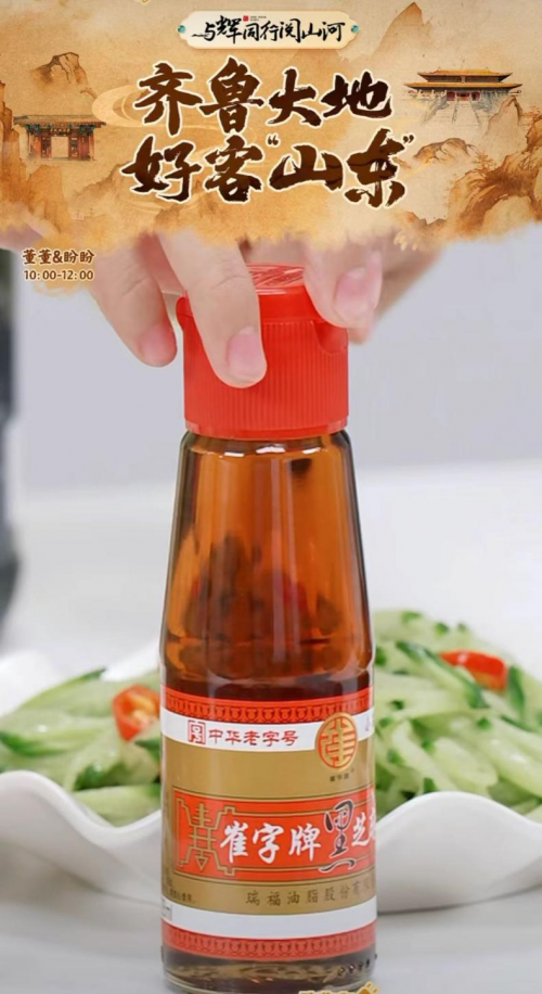 除了文化和历史的介绍,“与辉同行”直播间还为观众献上了山东本地的风俗特产。有早先在《舌尖上的中国》中爆火的“章丘铁锅”,也有前段时间争夺炒鸡之乡争的热烈的“临沂&枣庄炒鸡”,当然也有山东人从小吃到大的六百年老字号“崔字牌小磨香油”。