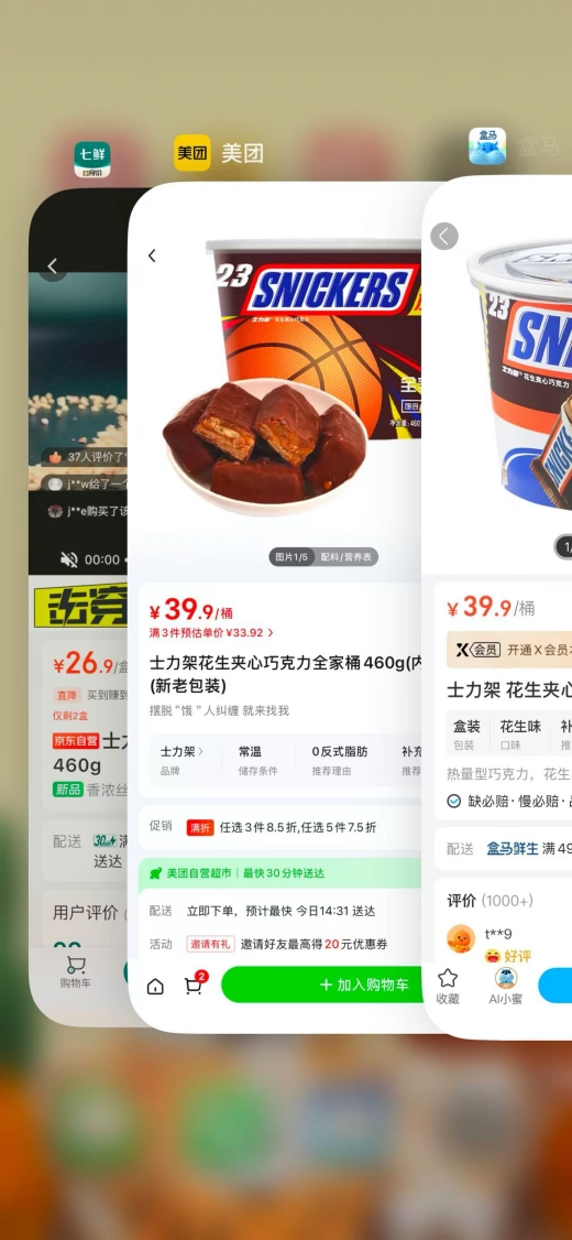 随着京东七鲜在即时零售领域掀起新一轮的价格风暴,美团小象与盒马正面临巨大的竞争压力。比较发现,京东七鲜在多个商品上均具有明显的价格优势。460克装的士力架花生夹心巧克力全家桶,京东七鲜击穿价仅为26.9元,美团小象、盒马均为39.9元。