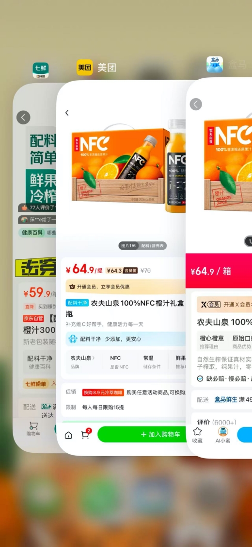 再以农夫山泉100%NFC橙汁礼盒为例,京东七鲜击穿价为59.9元,美团小象、盒马的售价均为64.9元。