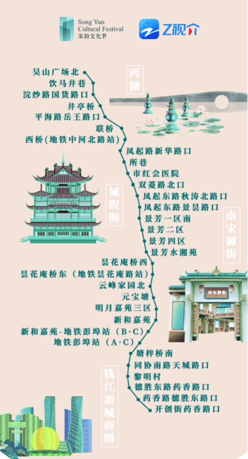 此次活动精选了两条具有代表性的公交线路——35路和71路。从吴山广场的历史沉淀,到湖滨、钱江新城的现代繁华,再到德寿宫、河坊街的古韵悠长,如同两条文化纽带,连接起了杭州的过去与现在。无论你是都市的匆匆行者,还是寻觅古迹的旅人游客,都能在这辆专列巴士上,找到属于自己的宋韵故事。