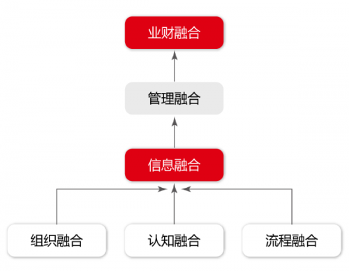 业财融合的5个“融合”相辅相成、互相支撑,信息融合(业财一体化)可以同时落地组织融合、认知融合、流程融合的结果,管理融合是业财融合的最终目标。