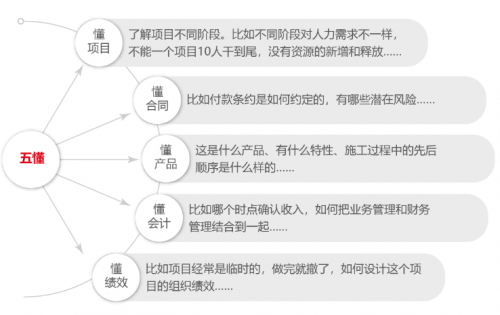 业财融合实施落地中,关键在于财务主动深入业务,同时财务职能也需要转型。正如华为对财务人员提出了“五懂”的要求:懂项目、懂合同、懂产品、懂会计、懂绩效。