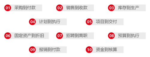 用友通过其先进的管理软件和解决方案,全面支撑企业十大业务循环端对端流程的落地。这些业务循环包括: