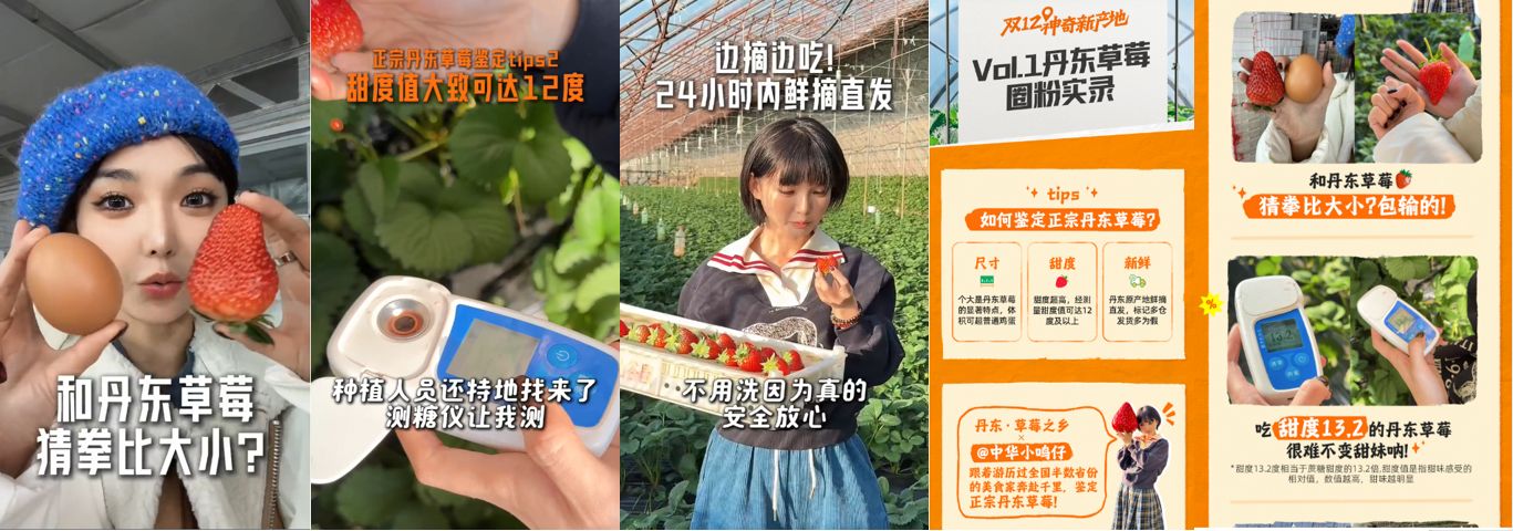 活动期间,淘宝新产地为不同类型的原产地好货打造了“新故事”。例如近年来水果界的“顶流”丹东草莓,冬天一到,全国的吃货都在等那颗草莓。为了让消费者买到更高品质、价格更优的丹东原产地草莓,淘宝新产地联合头部美食达人远赴丹东探访,为消费者鉴定原产好货。期间,#丹东草莓到底为啥能长这么大#、 #为什么大家都爱吃丹东草莓#等官方话题,登陆微博热搜榜。