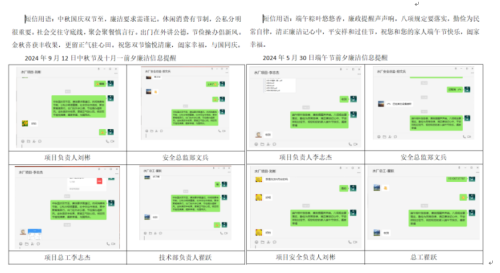 在进行定期开展廉洁教育的同时,项目部也将廉洁融入日常工作和生活中。通过建立陈超英廉洁文化示范点,视觉覆盖坚持做到“三进三上”。即廉洁标语、展板进施工现场、进会议室、进办公区域;廉洁标语、廉洁从业守则上墙面,廉洁格言上桌面、墙面、上电脑桌面,激发员工的廉洁意识和自律精神。每到节假日之前,项目部主动给项目关键岗位及家属发送廉洁提醒短信,让被动变为主动,使事后的被动监督变为事前的主动提醒,将贪污腐败消灭在萌芽状态。不仅增强了员工之间的团结,更使团队凝聚成了一个坚不可摧的廉洁堡垒。