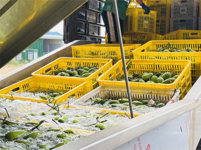 在产地采摘下来的小台农芒鲜果,在经由喜茶定制的水浴温烫设备进行表皮处理后,可以有效防止运输过程中黑点的产生,保持更好的新鲜度。随后,产地加工中心的工人对处理后的芒果还会进行二次分拣,并将挑选出的芒果结合泡沫纸等缓冲材料,完成打包装箱,规避运输过程中的损伤风险。打包好的芒果通过冷链运输至仓库。最终熟果以48小时一配的频率到达喜茶门店,门店则会根据品规书对小台农鲜果品质进行层层把控,并在门店端进行最后一道检测后,再将芒果清洗、鲜切,用于产品制备。
