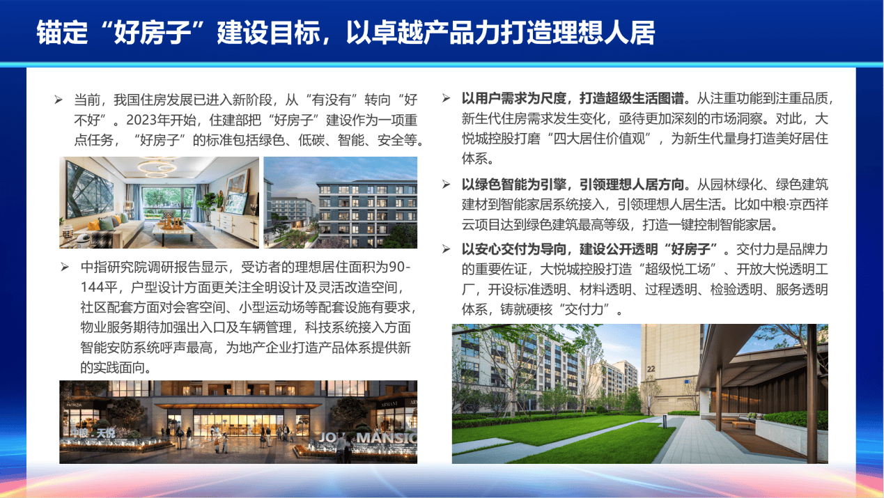 在住宅业态实践方面,城市综合体以用户需求为尺度、以绿色智能为引擎、以安心交付为导向,锚定“好房子”建设目标,以卓越产品力打造理想人居。以大悦城为例,其精心打磨了“四大居住价值观”,着力打造智能住宅生态,以“透明工厂”彰显硬核交付力,进一步提升品牌力。招商蛇口则推出“智慧健康科技4+X”系统,接入全屋智能技术、打造智慧社区。
