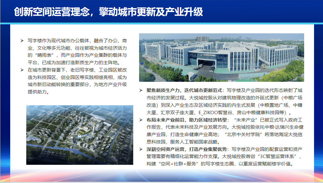 此外,城市综合体在布局写字楼产业园业态时,持续聚焦新质生产力、布局未来产业前沿、深耕空间资产运营,通过创新空间运营理念擎动城市更新及产业升级。例如大悦城从对建筑物理改造的外延式更新到深入产业生态及区域经济实践的内生式发展,打造了城市更新样板,同时布局未来产业,推出中粮·达瑞兴生命健康产业园、北京中关村学院等项目,为区域经济发展注入内生动力。