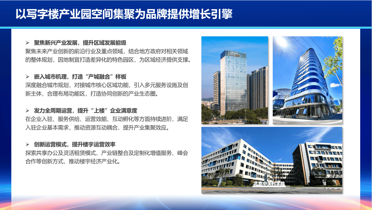 《报告》指出,在写字楼产业园空间集聚方面,要持续聚焦新兴产业发展、提升区域发展能级,嵌入城市机理、打造“产城融合”样板,发力全周期运营、提升“上楼”企业满意度,创新运营模式、提升楼宇运营效率。