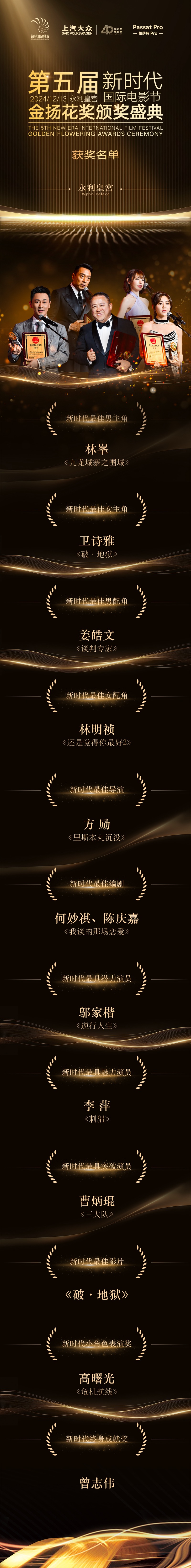 12月13日晚,第五届新时代国际电影节金扬花奖·上汽大众帕萨特Pro之夜颁奖典礼在澳门永利皇宫隆重举行,现场颁出各项大奖,《破·地狱》荣获最佳影片,卫诗雅凭借该片荣膺最佳女主角,林峯凭《九龙城寨之围城》夺得最佳男主角。方励凭借《里斯本丸沉没》摘得最佳导演桂冠。