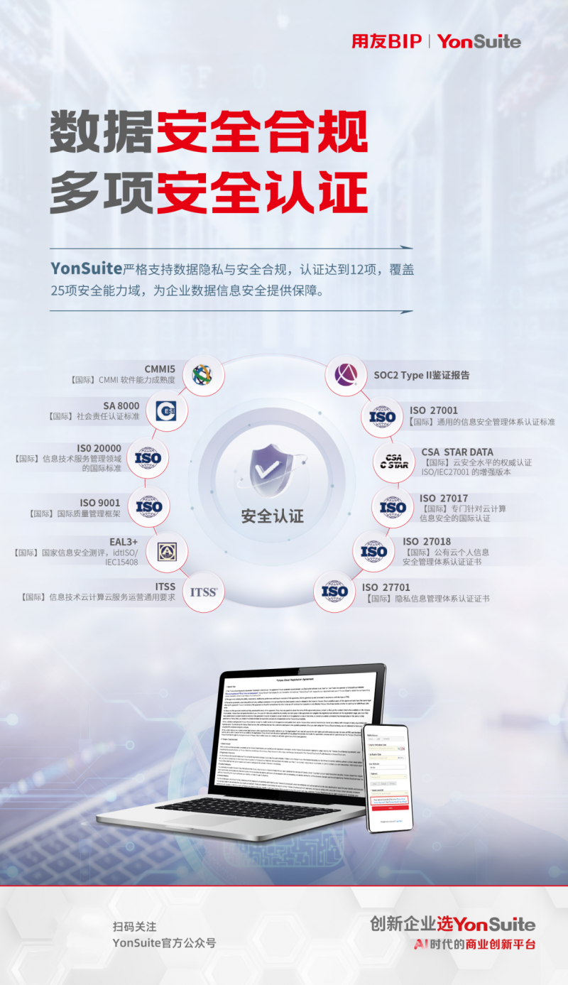 数智化工具能够实时监控各地政策变化,并提供合规性建议。例如,作为一款拥有SOC2 Type II鉴证报告的全球化SaaS平台,YonSuite不仅能满足企业在全球范围内的业务需求,还能提供全面的全球数据(数据安全、隐私、法律)合规解决方案,帮助企业在复杂多变的全球商业环境中游刃有余。