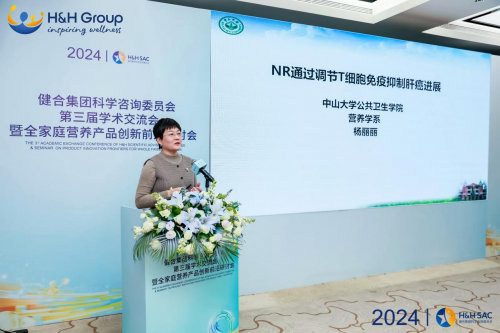 中山大学公共卫生学院营养学系主任杨丽丽教授围绕《NR通过调节T细胞免疫抑制肝癌进展》研讨话题,强调了NR等营养因素对未来人体健康防治产生的重要科研引领作用。