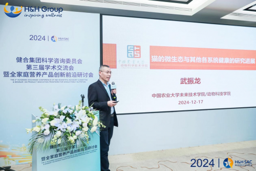 中国农业大学动物科学技术学院武振龙教授则分享了《猫的微生态与其他各系统健康的相关研究进展》研讨话题,不仅介绍了肠道益生菌在功能性宠物食品中的应用,还提出了猫的肠道微生物可能成为提高动物健康新靶点的见解,为宠物益生菌应用提供科学新方向。