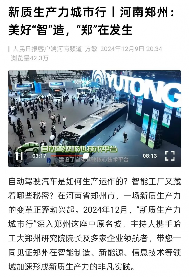 “新质生产力”自去年9月被提出,一直热度不减。它是国家战略的新要求,是各领域发展的新目标和改革的新任务。为见证新质生产力实践成果,《人民日报》特别策划“新质生产力城市行”,探索国内新质生产力优秀发展案例。近日,《人民日报》三次聚焦宇通,将其作为实践成果突出的样板案例,向全国展示制造行业新质生产力发展的蓬勃态势。