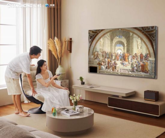 长虹 AI TV:极窄的边框设计,两侧边框还采用了东方卷轴画的设计元素,非常有中式美感。在辅以纯平超薄机身和0距离贴墙设计,摆在家中完全就是一副惊艳绝伦的古典壁画,艺术气质浓郁。