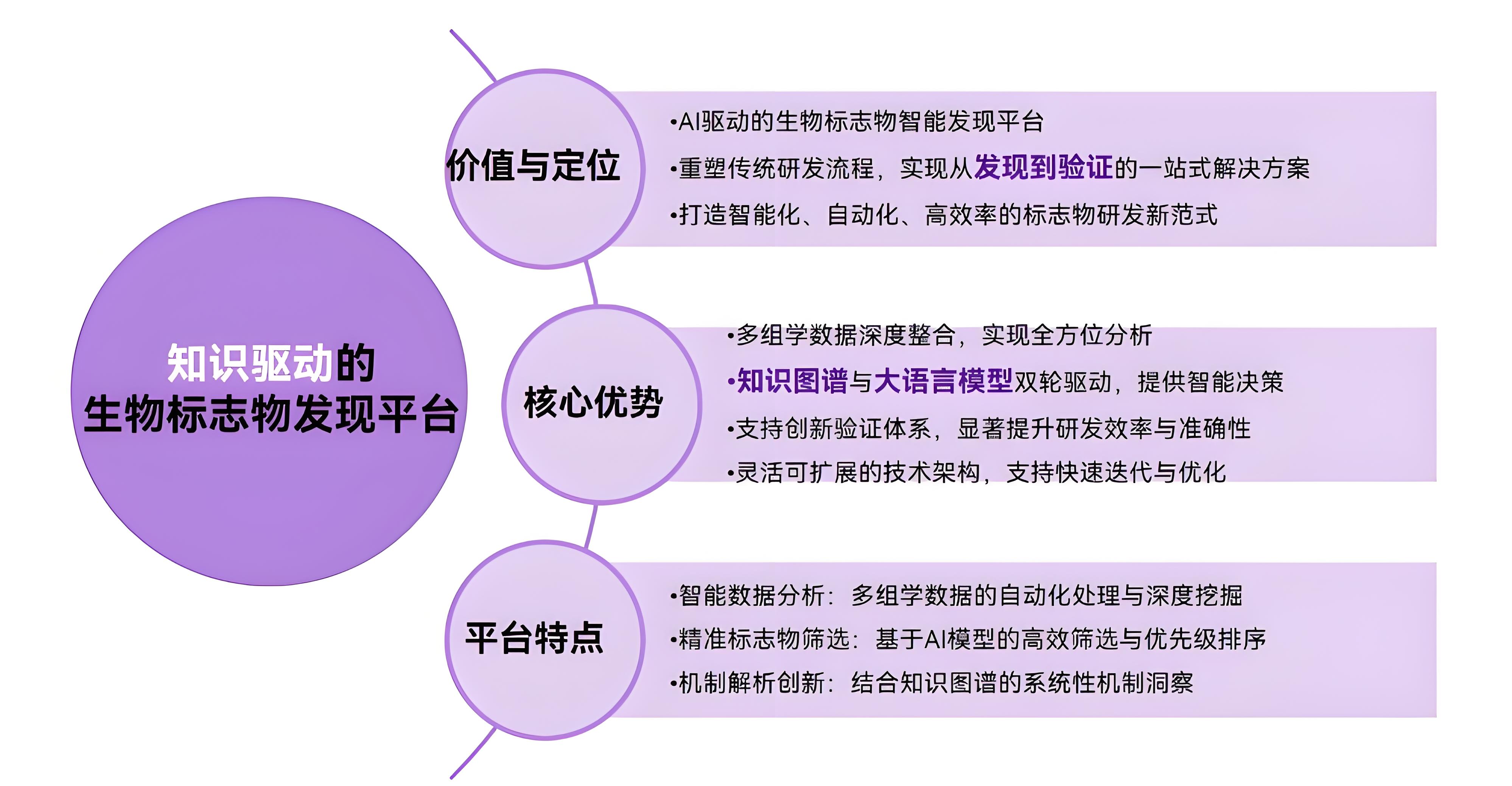 针对这一痛点,菲鹏结合前沿科技与业界需求,升级“数据驱动”的传统生物标志物发现方式,打造出国内首个知识驱动的生物标志物发现平台。该平台突破传统生信分析局限,整合起涵盖逾3万种疾病、超过20万种生物标志物的专业知识网络,配合大语言模型和深度学习技术,锤炼出一套“标志物筛选(发现)-机制解析(解释)-实验验证(验证)”的一站式智能研究服务体系。
