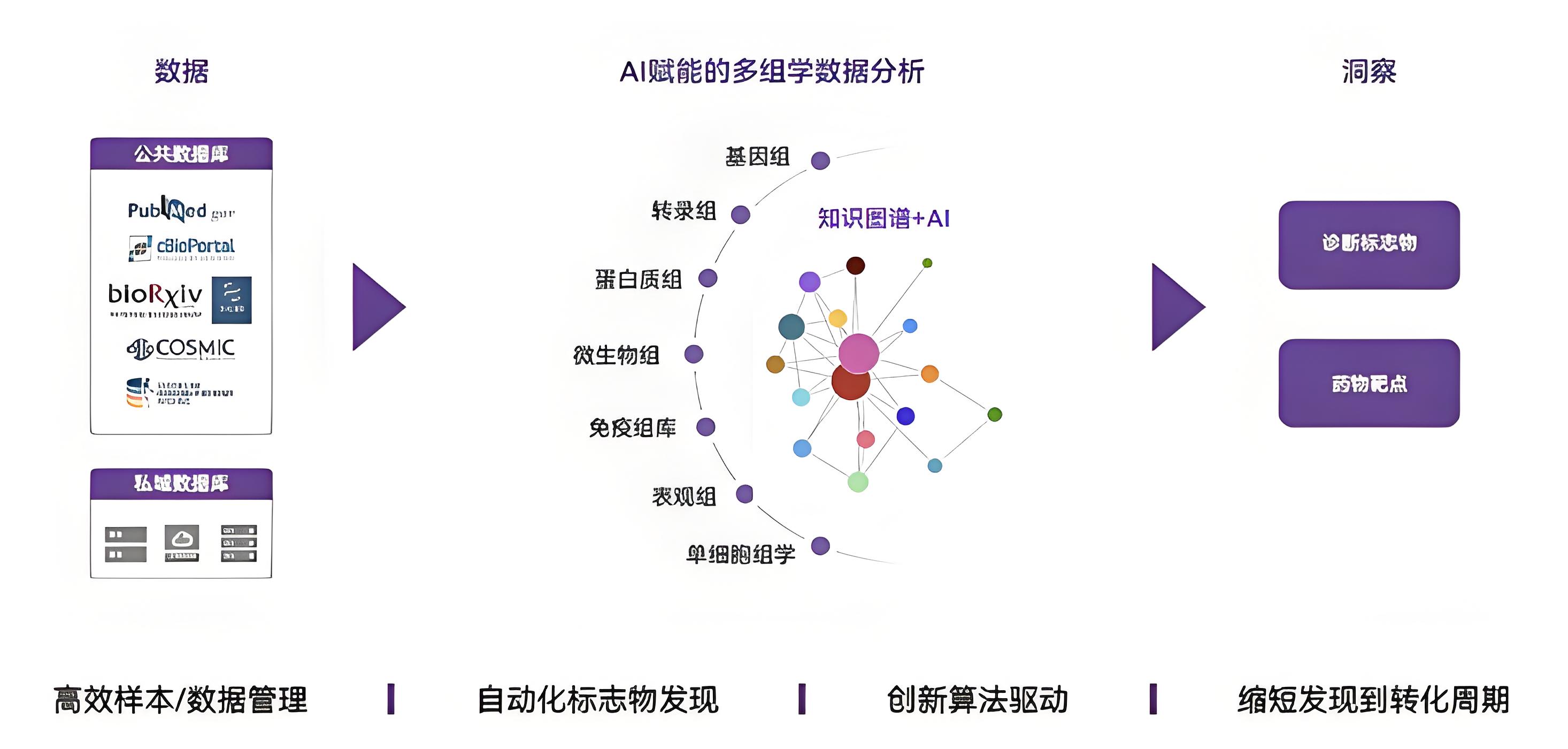 二是AI赋能创新服务。整合知识图谱、大语言模型等前沿AI技术,帮助研究者发现创新突破点,适合追求高水平成果发表的临床研究团队,包括知识图谱驱动的标志物筛选、智能机制解析引擎、一站式研究发现支持等。