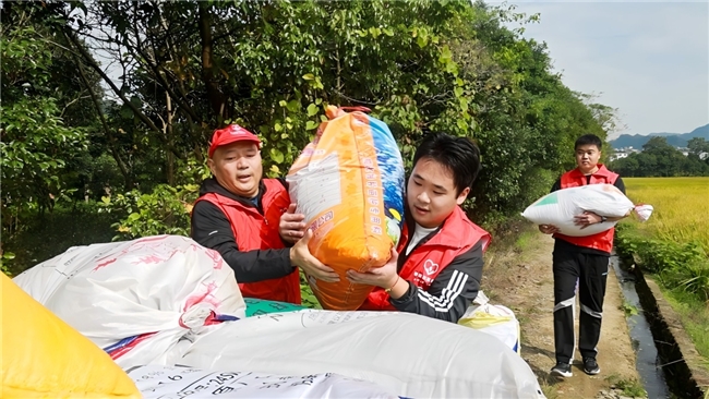 图为“香溢”志愿者帮助农户搬运水稻 傅彪摄