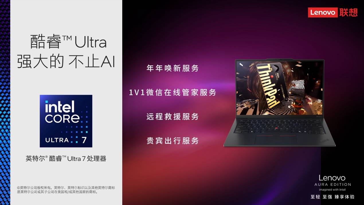 Aura系列是联想与英特尔联合研发打造的高端笔记本系列产品,ThinkPad X1 Carbon Aura AI元启版是联想Aura高端笔记本系列的先锋之作,具备“智能情景、无界互联、臻享服务”三大特征: