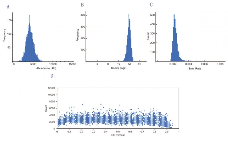 图A-C展示了包含3,000条Oligo的寡核苷酸池的质量控制数据,每条Oligo的合成长度为135nt。合成的寡核苷酸池经过扩增后进行了高通量测序分析。A. 3,000条序列的覆盖丰度;B.目标序列的均一性;C. 目标序列的合成错误率。图D展示了包含2,700条Oligo的寡核苷酸池的质量控制数据,每条Oligo合成长度为140 nt,扩增后在不同GC含量区域中表现出高均一性。