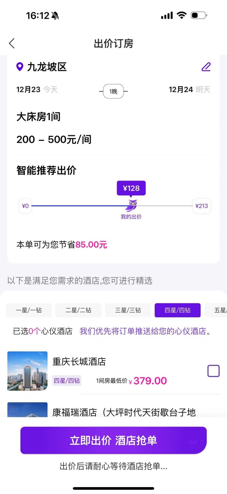 然而,在惠选订房平台上,用户可能只出价300元甚至更低,去预订该地段附近符合条件的四星级酒店房间。