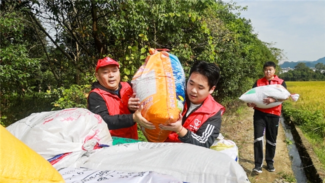 图为“香溢”志愿者帮助农户搬运水稻 傅彪摄