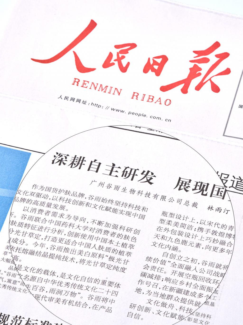 同时,在《人民日报》12月4日刊发的《汇聚各方合力夯实品牌根基》专题报道中,谷雨再次荣登版面,并在报道中全方位展现了品牌在"科技和文化双驱动"的发展模式下取得的创新成果。