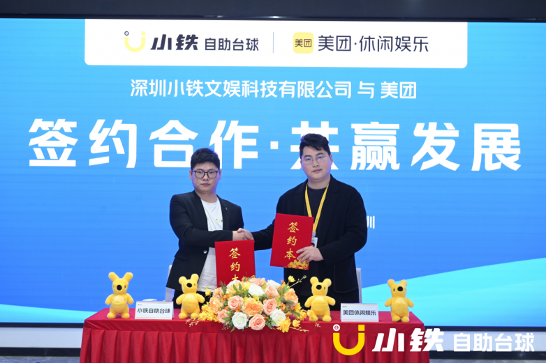 随后,陈孝钦与陶承东在小铁自助台球、美团双方各自相关业务负责人的共同见证下举办了盛大的签约仪式。