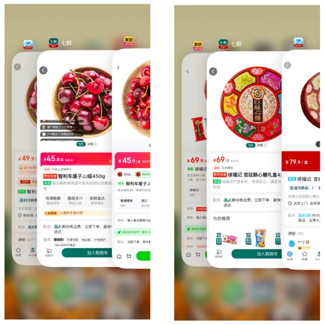 各式水果和甜品让新的一年先甜起来。京东七鲜智利车厘子JJ级色泽诱人,可口多汁,450克秒杀价45.8元,盒马同款同规格车厘子要卖到49.9元。徐福记宫廷酥心糖礼盒,京东旗七鲜售价69元,盒马售价79.9元,比京东七鲜高了16%。