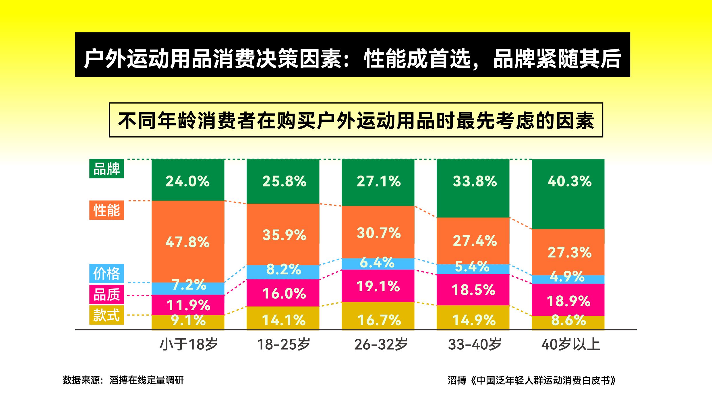 户外运动用品的消费者更加关注性能和品质,价格的敏感度相对较低。随着年龄增长,消费者对品牌价值和品质保障的关注度显著提升。
