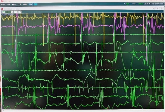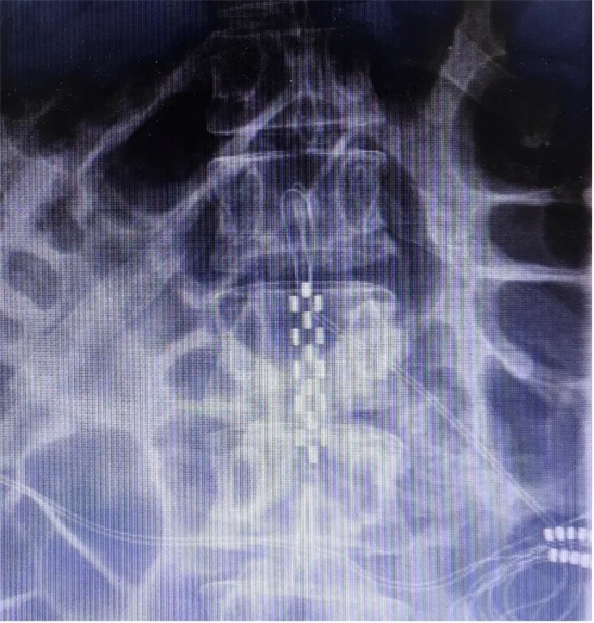 患者长期以来历经康复理疗及药物对症治疗,未见明显疗效,病情仍持续进展,此次专程为寻求脊髓电刺激神经调控治疗就诊。入院后神经调控专业组团队结合文献报道的相关治疗经验,并经过充分的讨论,同意实施脊髓电刺激治疗,以改善病人共济失调步态及平衡障碍。2024年11月20日,夏小雨主任团队为患者实施了胸腰段脊髓电刺激电极植入手术(SCS1期),在术中影像和术中电生理的保障下,1根5-6-5触点电极被准确植入到T12-L1硬膜外。
