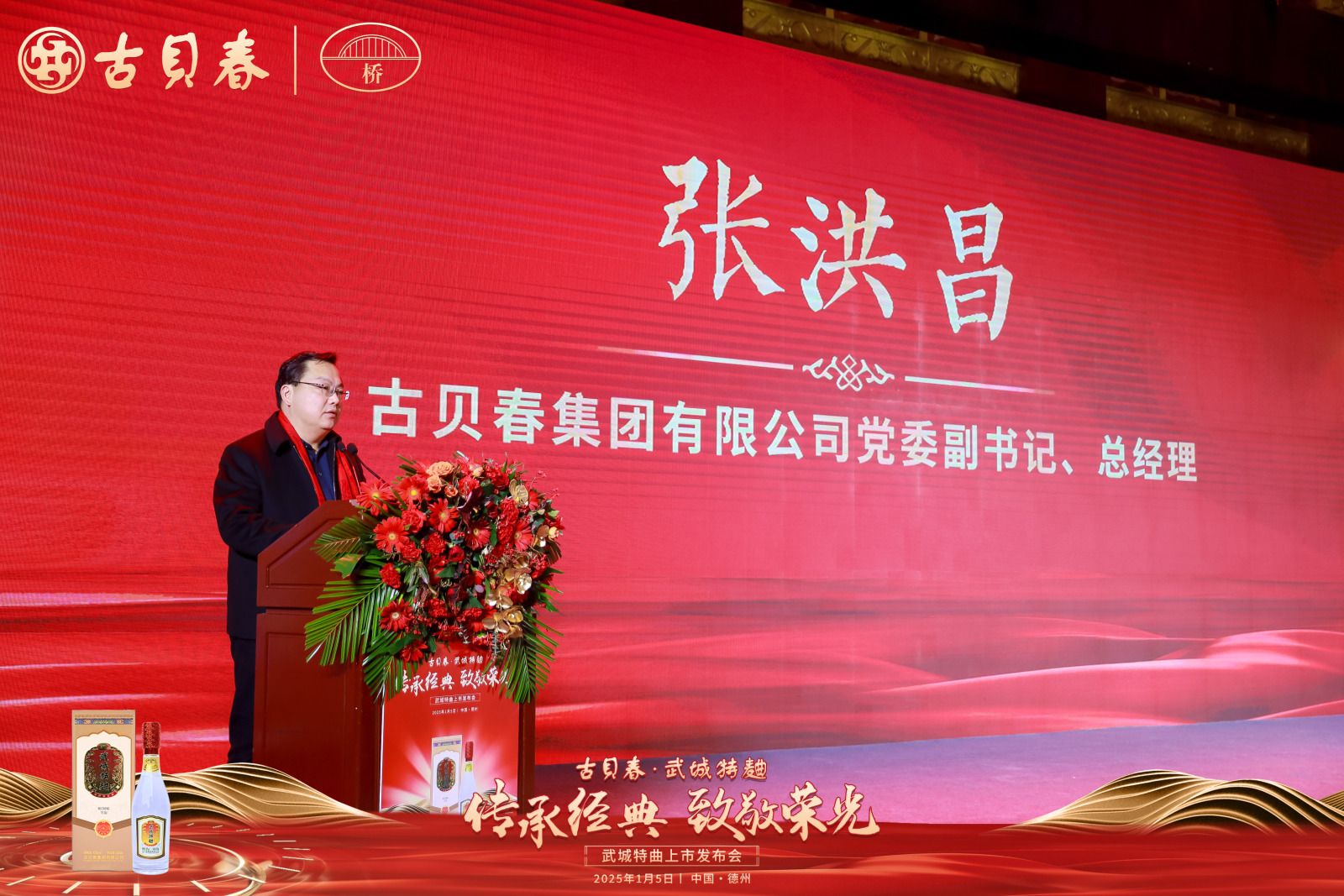 大运河畔,古贝春酒香。武城特曲隆重上市,这是古贝春集团的又一力作。古贝春集团有限公司党委副书记、总经理张洪昌发表了热情洋溢的讲话。古贝春集团作为山东白酒行业的领军企业,不仅是地方经济的重要支柱,更是我们城市形象的一张名片。多年以来,古贝春集团不断追求技术革新与工艺传承的完美结合,打造出了古贝元1983、白版双子星、百年老窖等一系列高品质美酒,赢得了市场、实现了品牌跃升,集团的发展也呈现出勃勃生机。从1975年到2025年,这五十年,是武城特曲不断追求酿酒技艺极致、坚持科学酿酒原则、匠心独运的奋斗历程。武城特曲是古贝春集团的时代经典作品,集团将一如既往地为大桥酒业发展保驾护航,提供更加贴心的服务保障,彰显企商合作典范,帮助大桥酒业做大做强。