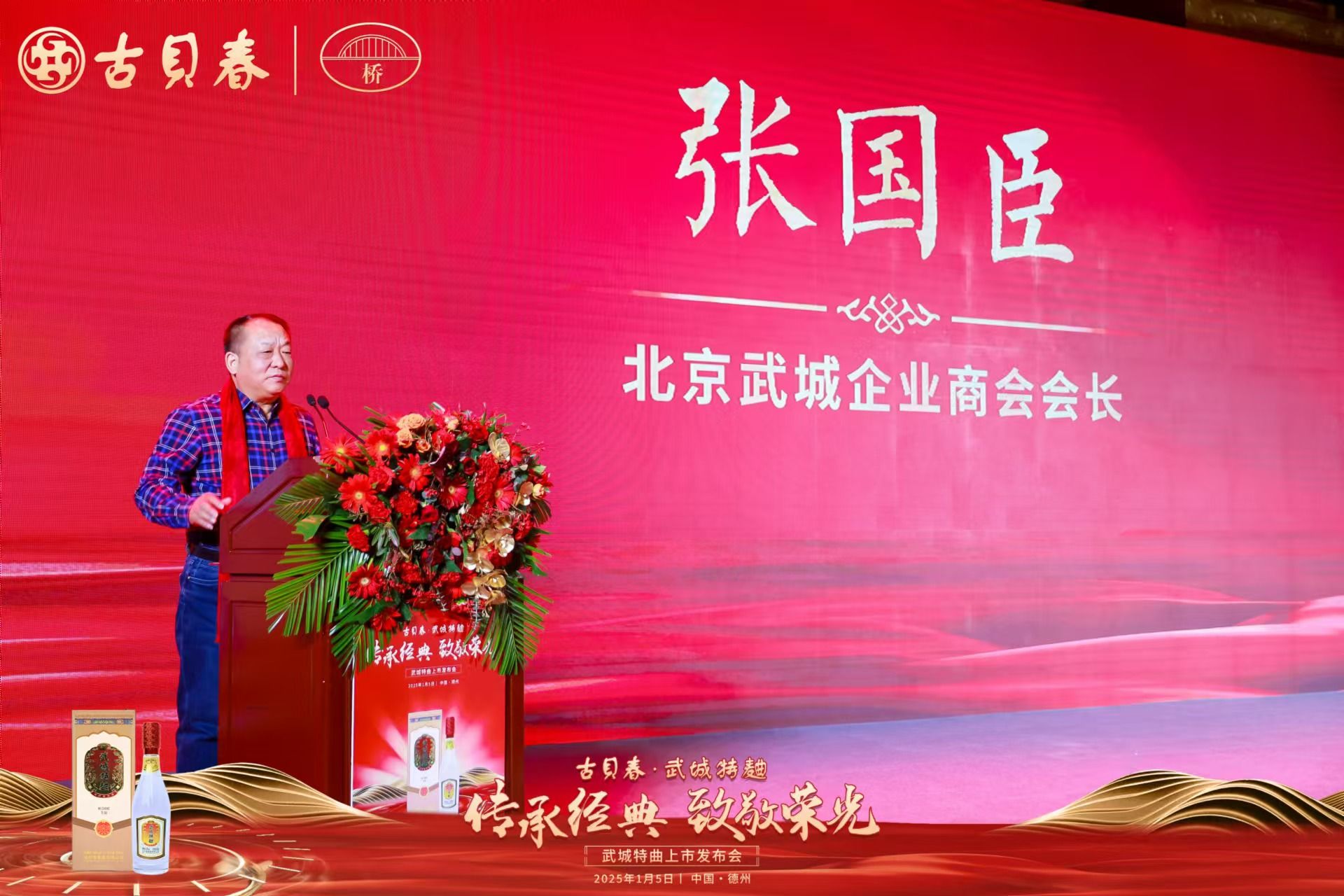 北京武城企业商会会长张国臣作为嘉宾代表致辞。张国臣说,武城特曲历史文化底蕴丰厚,是武城的一张闪亮名片,它不仅承载着地域的风味与文化,更蕴含着武商精神的精髓。今天武城特曲的荣耀上市,不仅是对传统酿酒工艺的传承和发扬,更是武城人“追求卓越、勇于创新”精神的生动体现。近年来,在政府以及社会各界人士的支持下,武城商会充分发挥武城与外地的桥梁纽带作用,共同推动企业做大做强,不断为家乡的经济社会发展作贡献,取得了令人满意的优异成绩。未来,武城商会将持续把武城特曲、武商精神这两张耀眼的名片发扬光大。