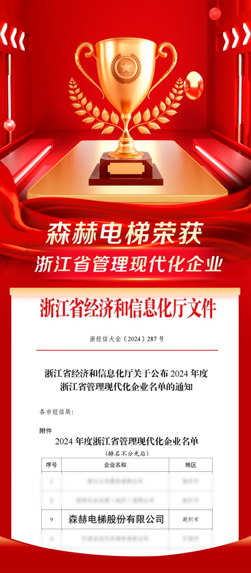 浙江省经济和信息化厅公布2024年度浙江省管理现代化企业名单的通知,森赫电梯荣耀登榜,成为20家企业中唯一一家电梯企业。
