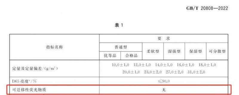 ▲GB/T 20808-2022《纸巾》国家标准对可迁移荧光物质要求