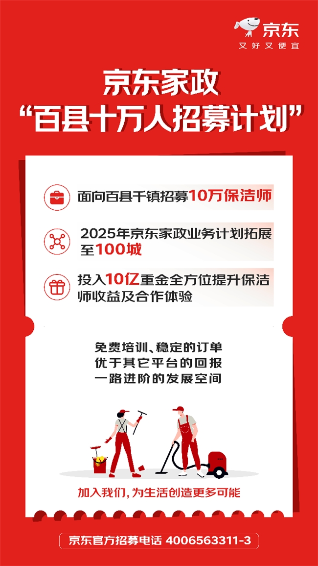 岁末正值家政需求旺季,据央视新闻报道,很多家庭都在预约深度保洁服务,京东家政收到的保洁订单剧增,现有人手供不应求。为满足连年增长的家政服务需求,推动高质量就业,1月7日,京东家政开启“百县十万人招募计划”,面向百县千镇招募10万保洁师。2025年京东家政业务计划拓展至100个城市,并投入10亿资金全方位提升保洁师收益及合作体验。