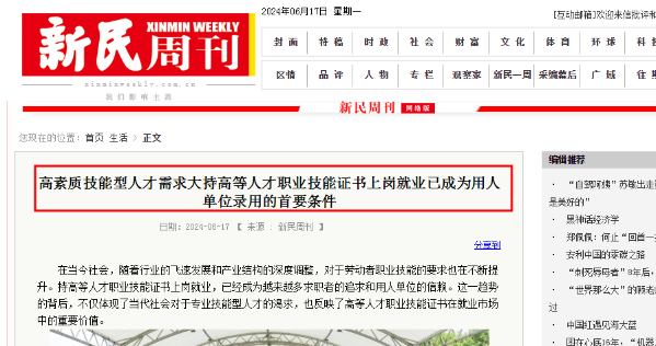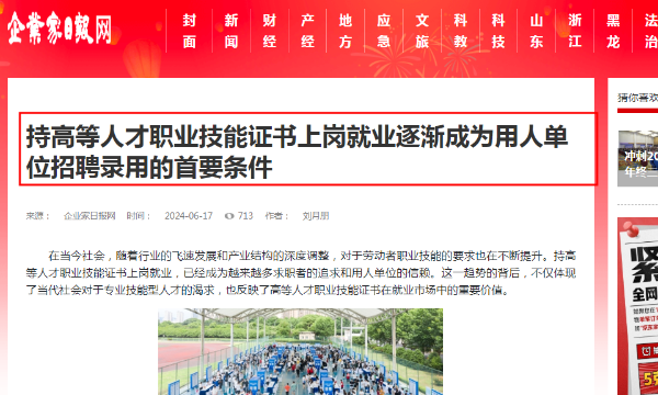 企业家日报,新民周刊官方报道:持高等人才职业技能证书上岗就业逐渐成为用人单位招聘录用的首要条件