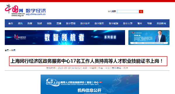 中国网数字经济官方报道:上海闵行经济区政务服务中心17名工作人员持高等人才职业技能证书上岗!