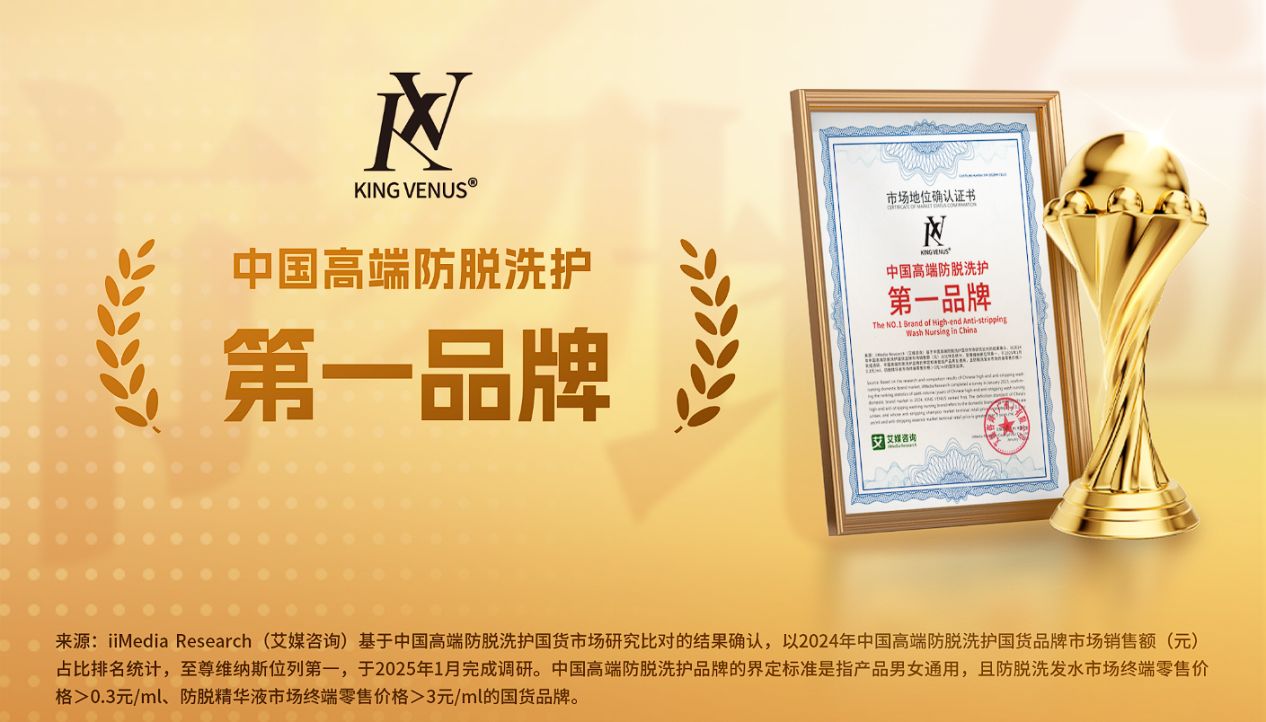 2024年12月,至尊维纳斯获全球新经济产业第三方数据挖掘和分析机构iiMedia Research(艾媒咨询)授予的“高端防脱洗护全国销量第一”“中国高端防脱洗护第一品牌”两项市场地位确认。