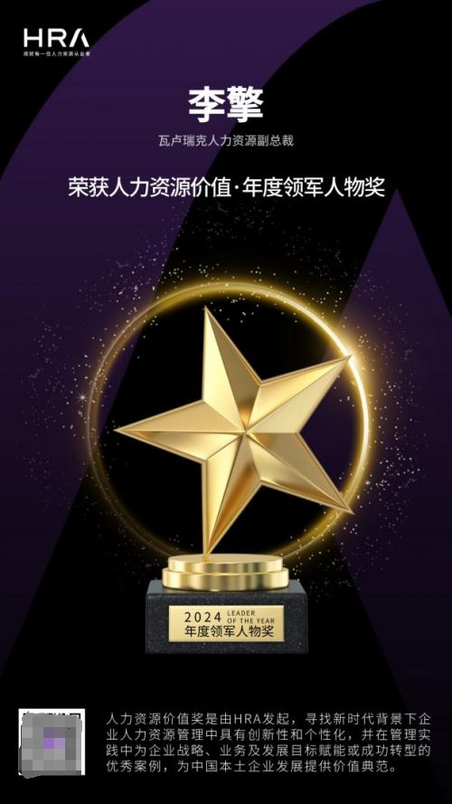 近日,在2024年“HRA人力资源价值奖” 评选中,瓦卢瑞克(中国)有限公司斩获 “中国人力资源价值大奖”,其人力资源副总裁李擎女士也荣膺 “人力资源年度领军人物” 称号。这一由北京中外企业人力资源协会(HRA)主办的奖项,旨在表彰在企业管理实践中,对人力资源管理领域具有重大影响力与卓越价值的案例及个人。瓦卢瑞克的获奖无疑是对其在人力资源领域不懈努力与杰出表现的有力证明。
