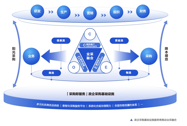 白皮书提出基于采购基础设施服务商的 “OEC” 价值模型,助力政企客户实现业务与采购双向融通、深度融合,推进政企采购信息流、商流、物流和资金流 “四流合一”,实现采购与研发、生产、营销、组织、财务的“五大融合”。