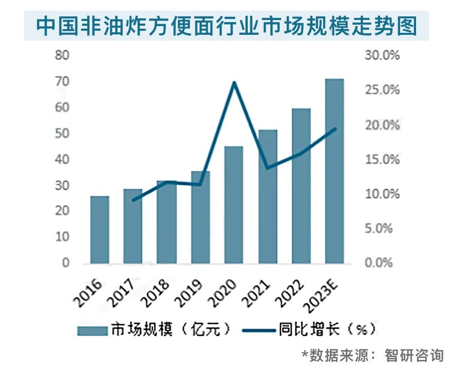 最近这些年,健康化成为了大众饮食的一大趋势。在这一趋势下,“非油炸方便面”成为新一轮风口。据智研咨询报告数据显示,非油炸方便面在过去几年的市场规模增速超过了10%,预计未来将继续维持在这一增速水平,成为方便面行业中的“新蓝海”。