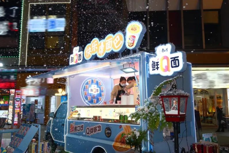线下,康师傅的品牌推广车“快乐康面巴”是一大亮点,推广车这种形式流动性好,更有利于实现人群和场景的触达。寒冬时节,这辆车出现在商场、集市、游乐场等年轻人聚集地,被吸引而来的年轻消费者前来体验鲜Q面的美味,很多人第一时间在社媒打卡、分享、反馈。“跟现煮的口感一样”、“吸满了汤汁好入味”、“在冬日里吃到冒着热气的‘鲜Q面’”……大家好评不断,温馨幸福的氛围直接拉满,“鲜Q口感,宛如现煮”的认知也悄然在消费者中形成和扩散。