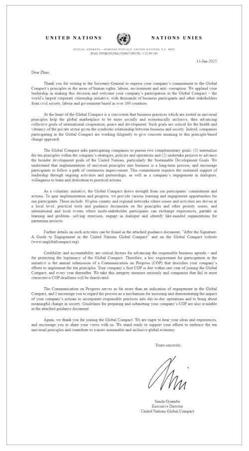 2025年1月15日,华熙生物正式加入联合国全球契约组织(United Nations Global Compact,简称 UNGC)。这一里程碑式的举措,标志着华熙生物在推动全球可持续发展方面的努力与承诺赢得国际认可。