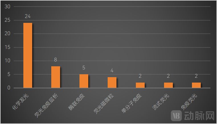 获批的AD血液检测试剂盒中,采用化学发光技术的最多,有24款,采用酶联免疫技术的有5款,采用单分子免疫技术和流式荧光技术的分别有2款。暂时没有基于质谱法的血液检测试剂盒获批。