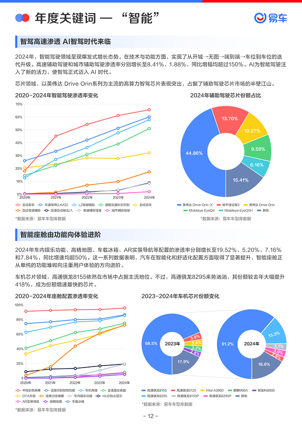 2024年车内娱乐功能、高精地图、车载冰箱、AR实景导航等配置的渗透率同比增速均超50%。车机芯片领域,高通骁龙8155依然在市场中占据主流地位。