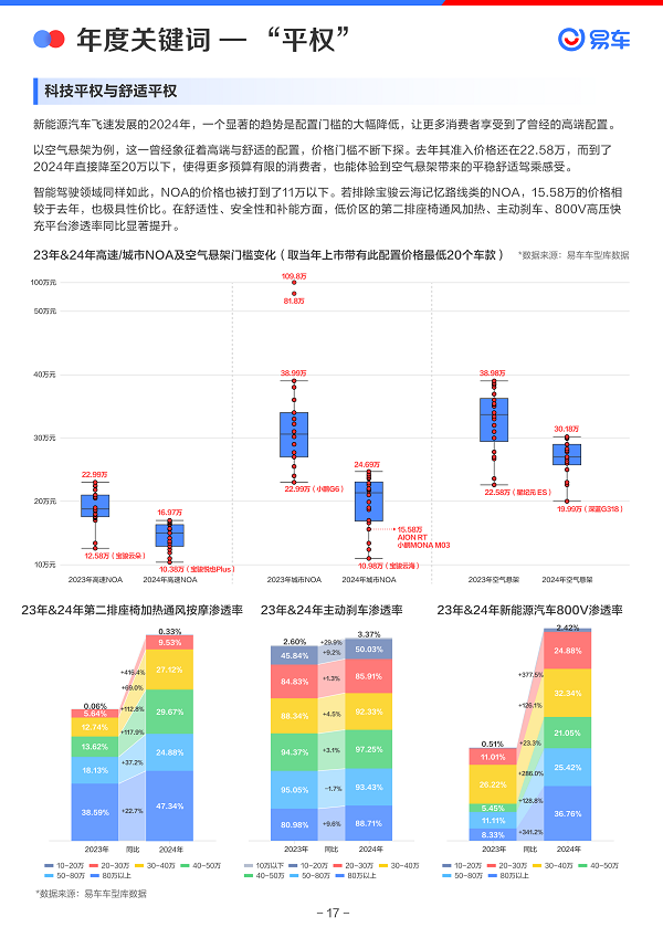 智能驾驶领域同样如此,NOA的价格也被打到了11万以下。在舒适性、安全性和补能方面,低价区的第二排座椅通风加热、主动刹车、800V高压快充平台渗透率同比显著提升。