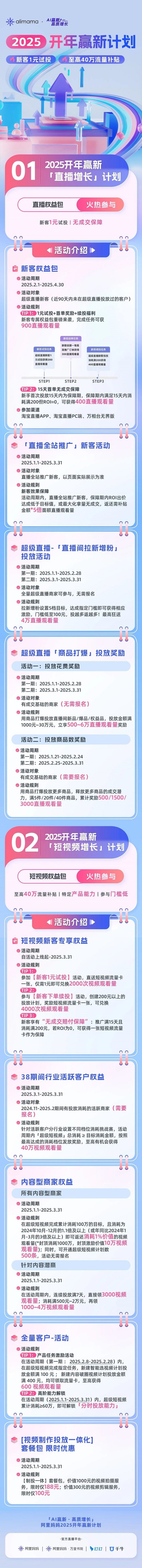 为助力品牌商家拿下开年之际第一波消费红利,阿里妈妈聚焦开年赢新、38大促分别带来直播及短视频两大场景多重福利活动:面向有直播需求的商家,推出2025开年赢新「直播增长」计划,涵盖「新客权益包」、「直播全站推广」新客活动、「直播间拉新增粉」投放活动、「商品打爆」投放奖励等活动,在活动周期内成功参与的商家可获得【新客1元试投】、【首单无成交保障】等对应权益;面向短视频投放需求商家,推出2025开年赢新「短视频增长」计划,新客、38期间行业活跃商家、内容潜商、内容型商家、全量客户等不同类型商家均享有专属活动政策,参与活动后,便可获得【至高40万流量补贴】、【解锁分时投放高阶能力】、【视频制作投放一体化套餐包】等不同激励补贴。