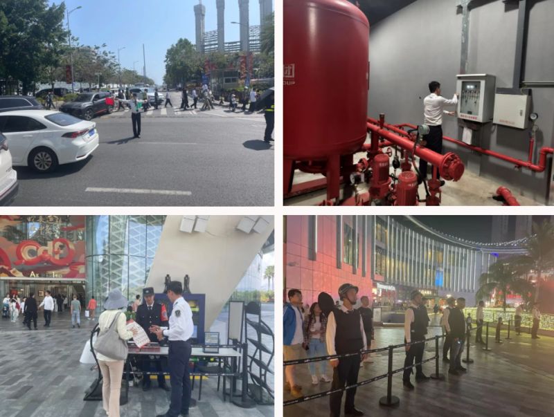 在停车场,他们指挥着过往的交通,疏导着拥堵的路段;在设备间,他们认真检查每一台设备,确保平稳运行;在执勤岗,他们一遍遍回答着顾客的提问;在节目演艺区,他们排成一排筑起一道“安全墙”。