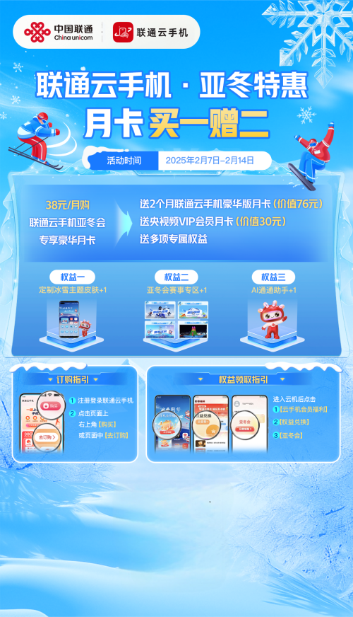 现在起购买联通云手机亚冬会专享豪华月卡(38元/月),即赠送2个月豪华版月卡(价值76元)+央视频VIP月卡(价值30元)+AI不限量特权,同时还能享受多项专属权益,包括定制冰雪主题皮肤、亚冬会赛事专区访问权限以及AI通通助手服务。